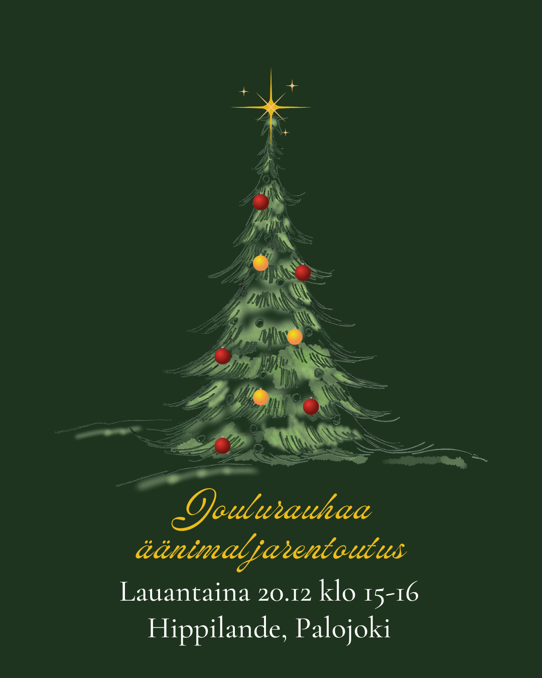 Lauantaina 20.12 klo 15-16. Hippilande, Maisinkuja 41, Palojoki. 25€/hlö.