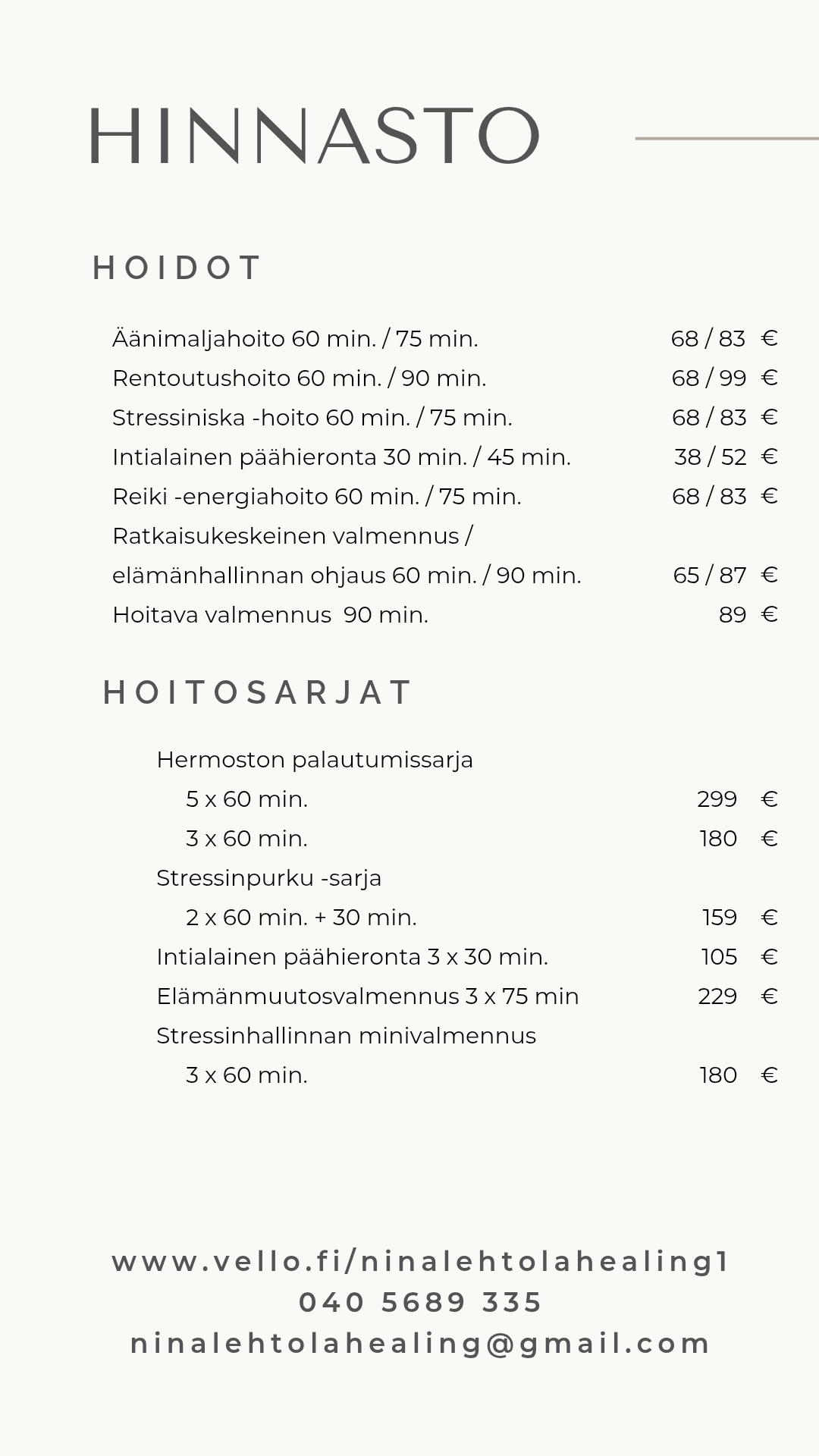 Olemme avoinna sopimuksen mukaan. Vapaita aikoja voi varata nettiajanvarauksen kautta, viestillä ninalehtolahealing@gmail.com, tai puhelimitse 040 5689 335 (en pysty päivällä vastaamaan puheluihin, joten viesti on varmin tapa tavoittaa minut).